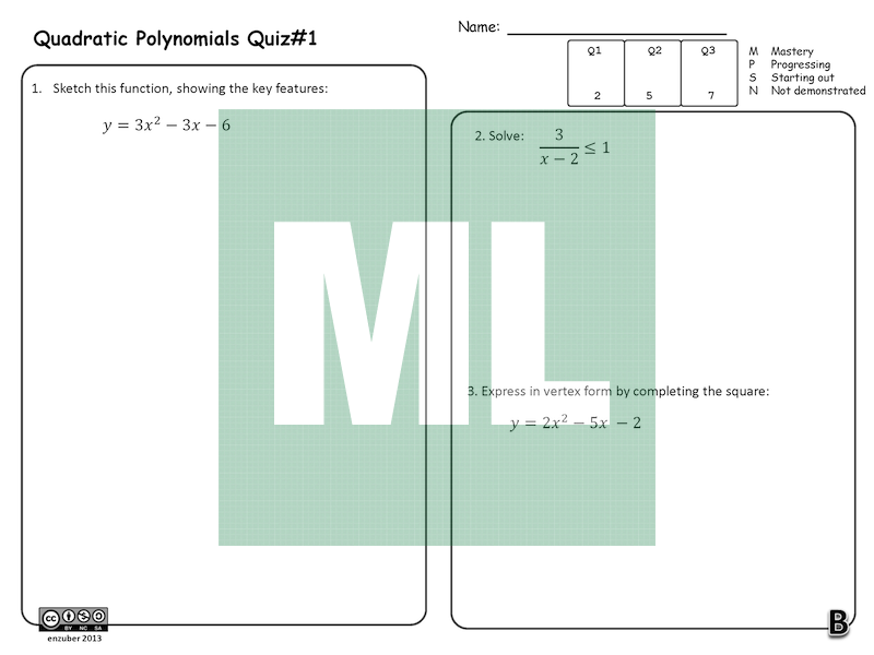 ABCD diagnostics quizzes to check: can student graph a quadratic function, can they solve a quadratic inequality (in the form of an inequality with pronumeral in the denominator), can they complete the square of a non-monic quadratic.