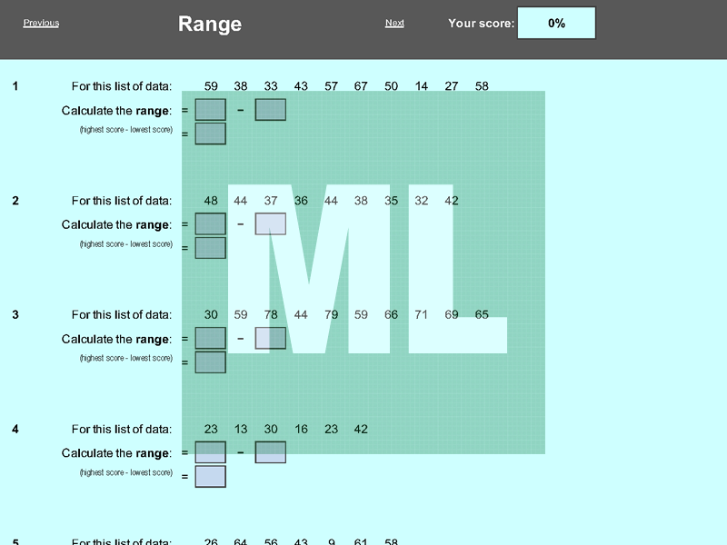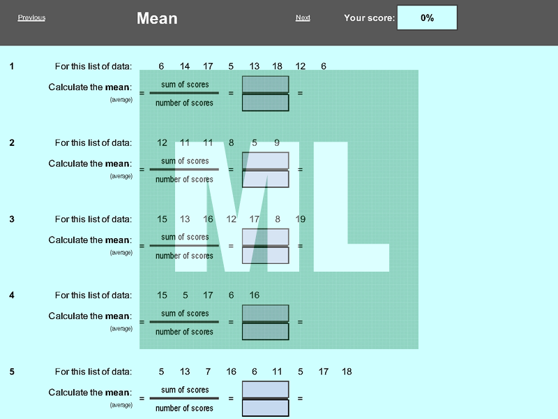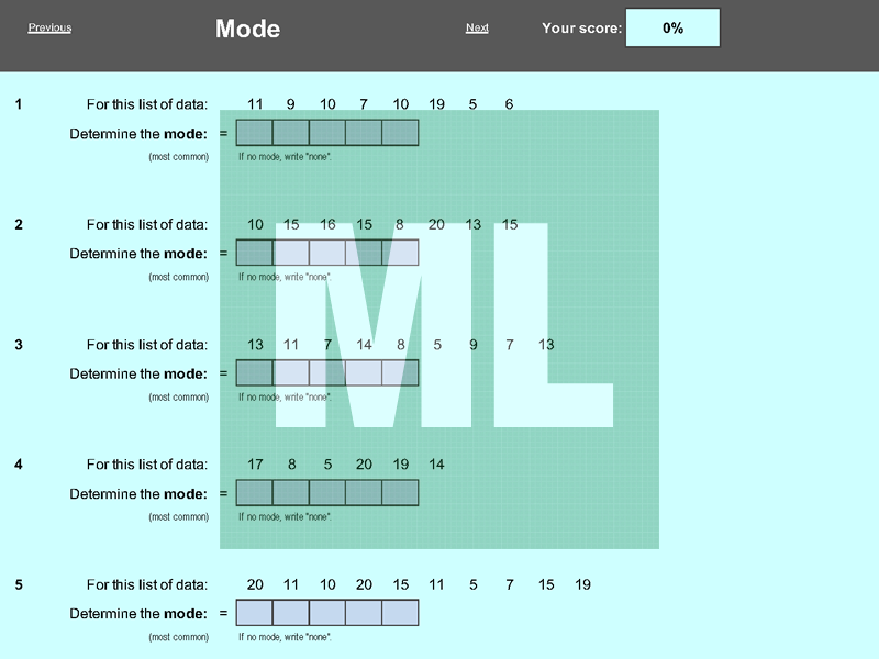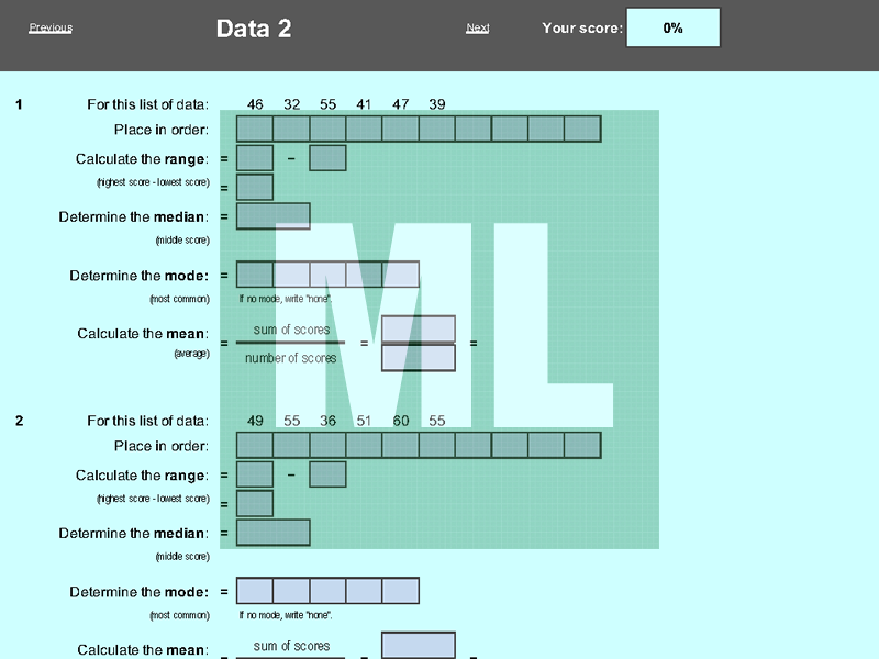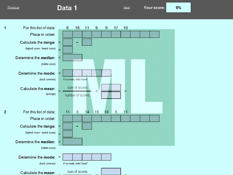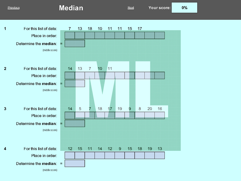 An electronic working that scaffolds the calculation of median, mode, range and mean.