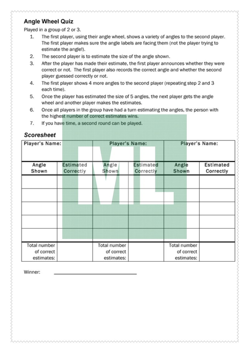 The instructions are all in the worksheet. With some folding, a bit of measuring and a couple of cuts, you create two inter-locking circles, that can be rotated to reveal different angles. The angle wheel can then be used as part of a game or for future revision.