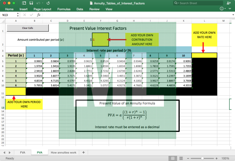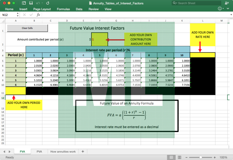 Interactive spreadsheet containing both present and future value tables of interest factors for annuities. Good for introduction to annunities and demonstration of how to use the tables.