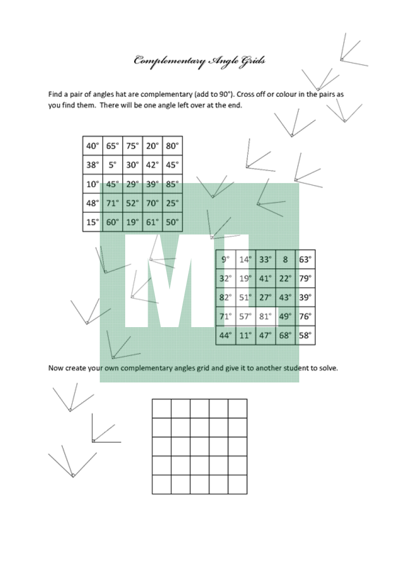 Students cross off pairs of angles that are complementary until one angle remains without a pair. Worksheet contains two grids to complete and one blank grid to create (plus instructions). Based on a Counting On activity (add to 10).