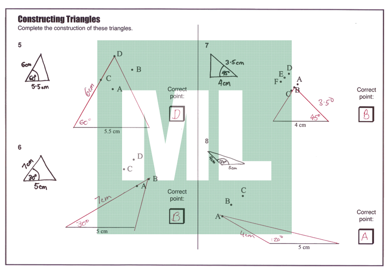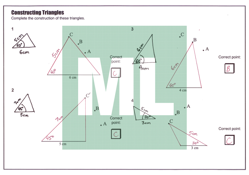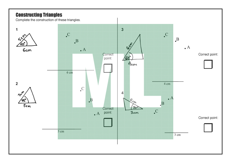 A worksheet on constructing triangles given side-angle-side. Designed for use with 30-60-90 and 45-90-45 set squares.