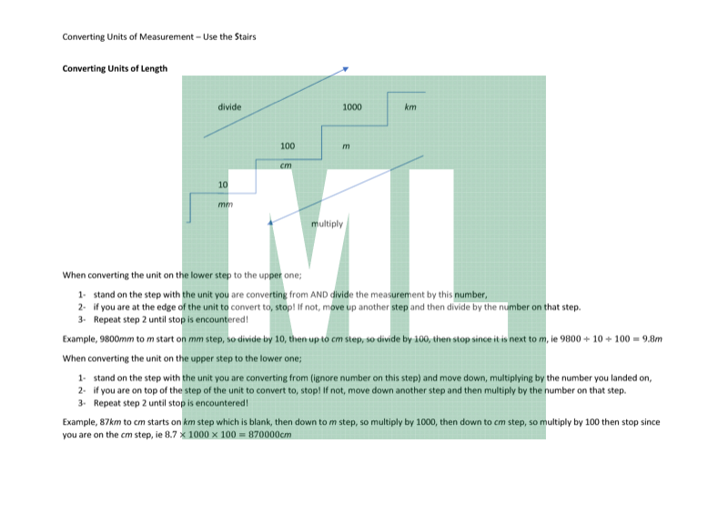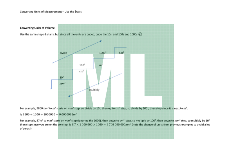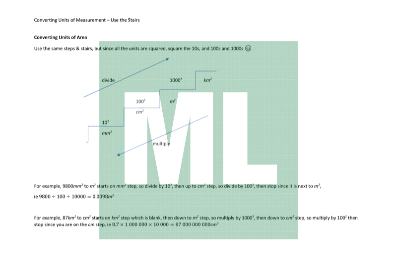 Using stairs as a memory tool for conversion of units of length, area and volume. Includes explanation and example.
