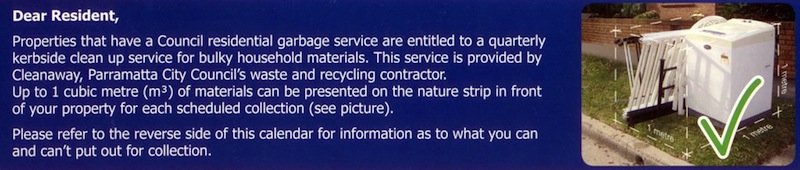 Scan of a part of a leaflet from a local council about their quarterly clean-up. Represents the amount of garbage that can be disposed of as a cubic metre.