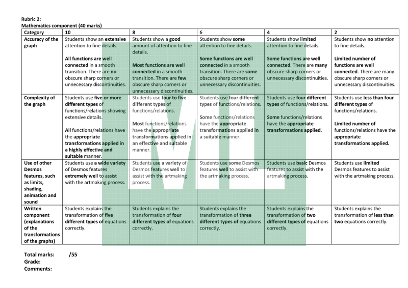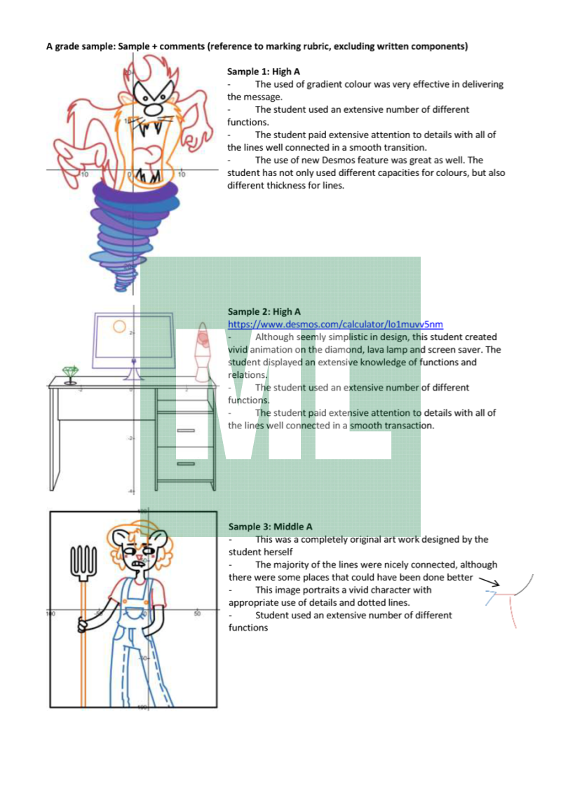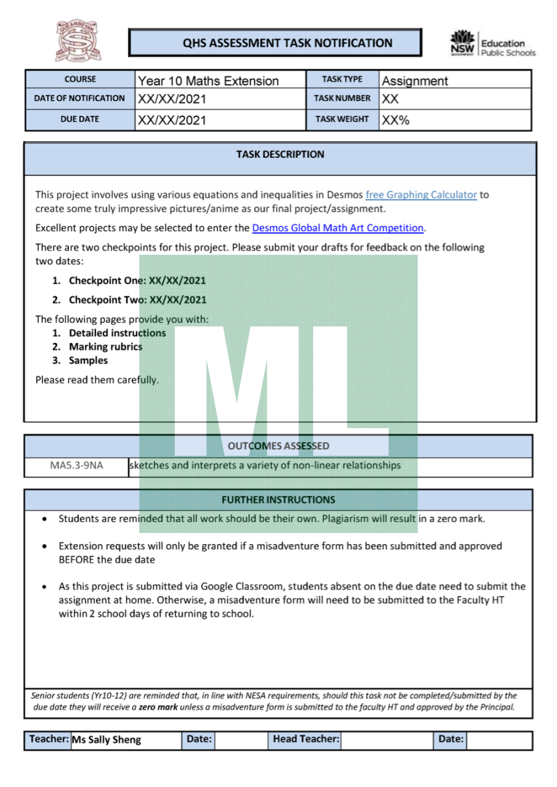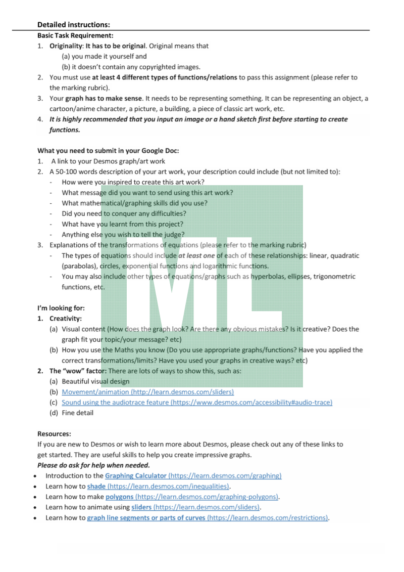 This is an assessment notification of the Desmos Art Project/Assignment I conducted at Queanbeyan High School. It includes the structure of this project, the marking rubrics and graded samples. The graded samples are taken from my students' works from 2020.