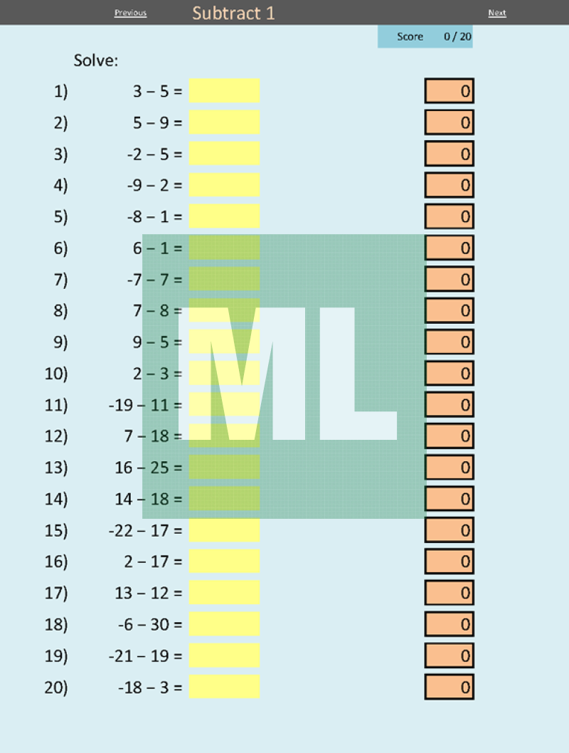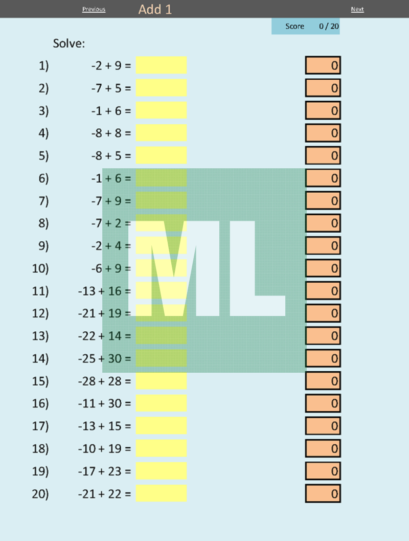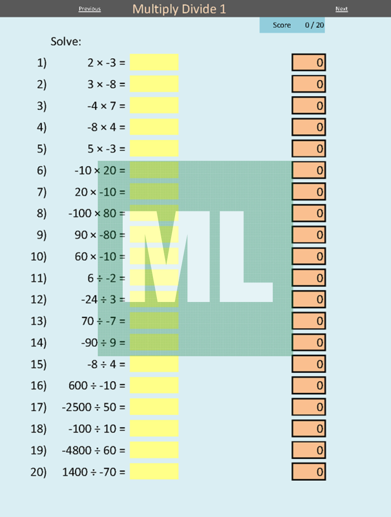A self-marking electronic worksheet for directed number practise. Includes addition, subtraction, multiplication and division questions.