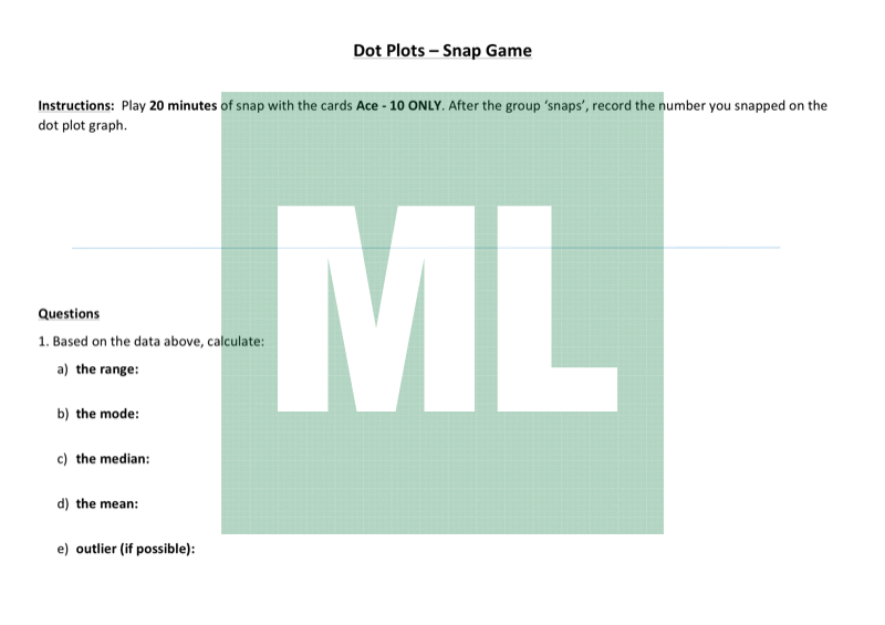 A worksheet for drawing dot plots based on the Snap card game (explanation of Snap). Used to increase engagement and for students to collect their own data.