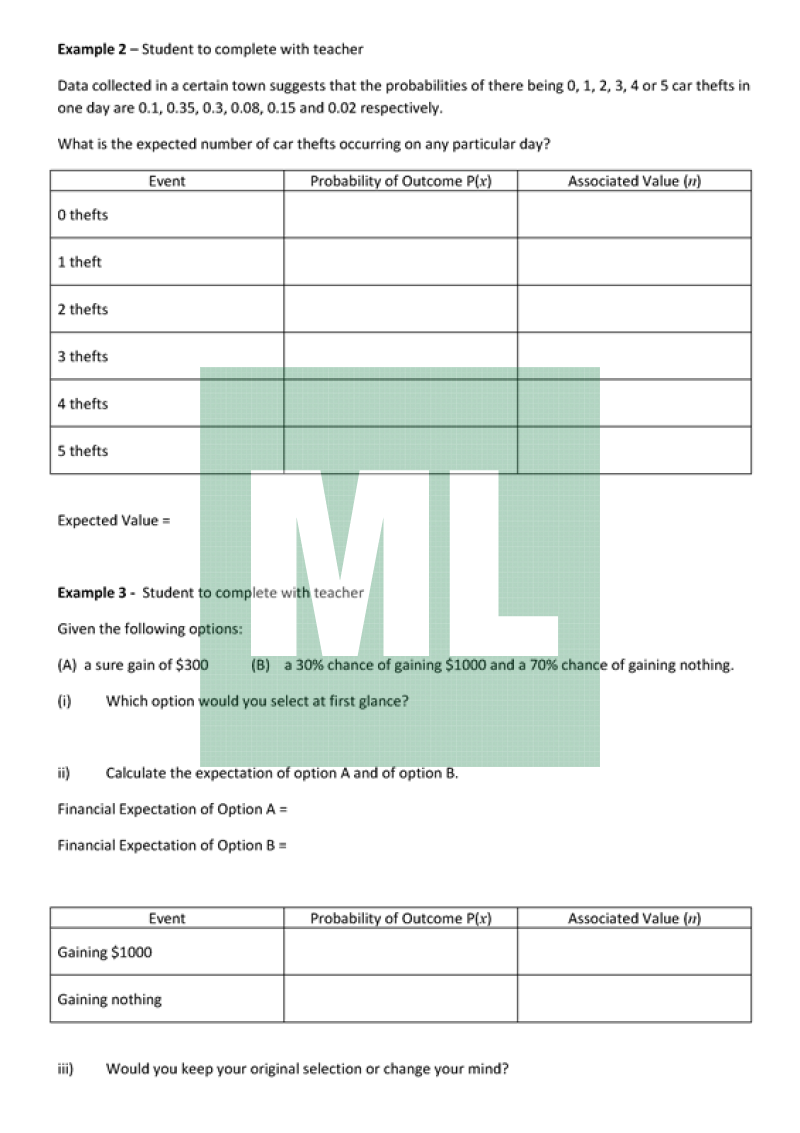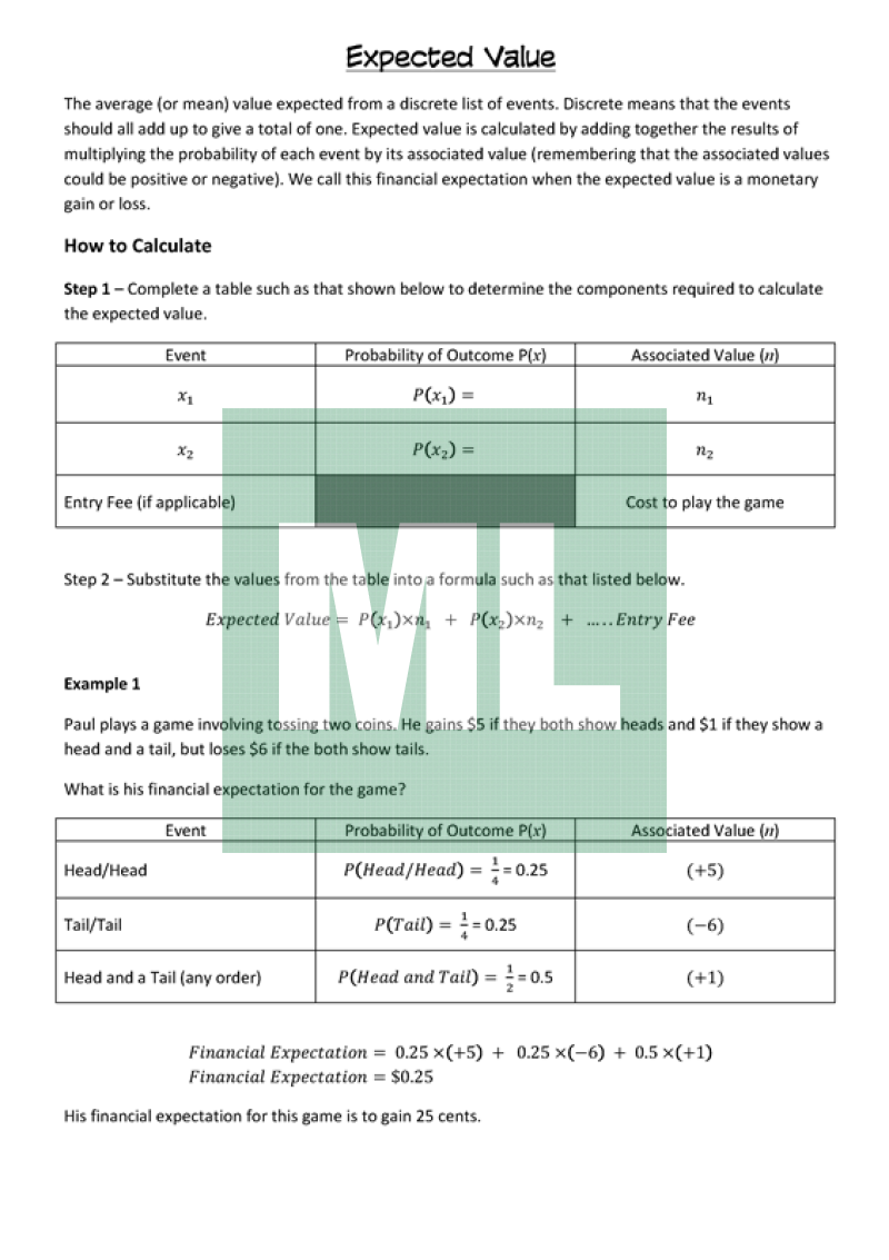 Notes on how to calculate expected value for students undertaking General Mathematics. Includes one worked example and two for students to complete during teacher discussion and demonstration.
