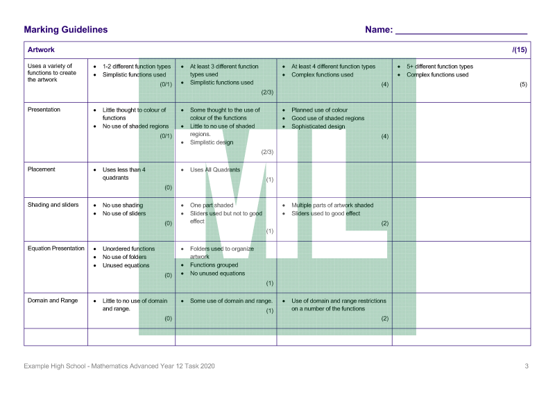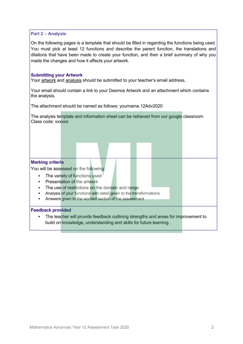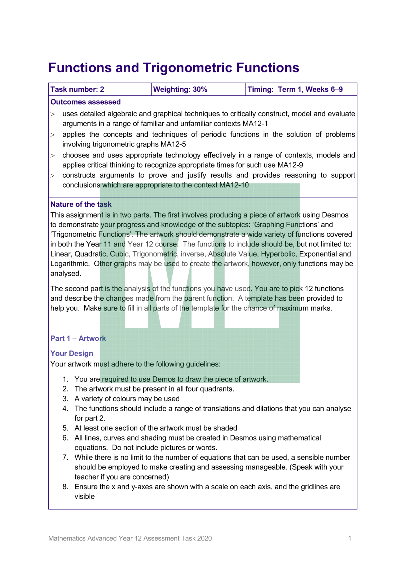 This assignment is in two parts. The first involves producing a piece of artwork using Desmos to demonstrate progress and knowledge of the subtopics: ‘Graphing Functions’ and ‘Trigonometric Functions’. The second part is the analysis of the functions used.