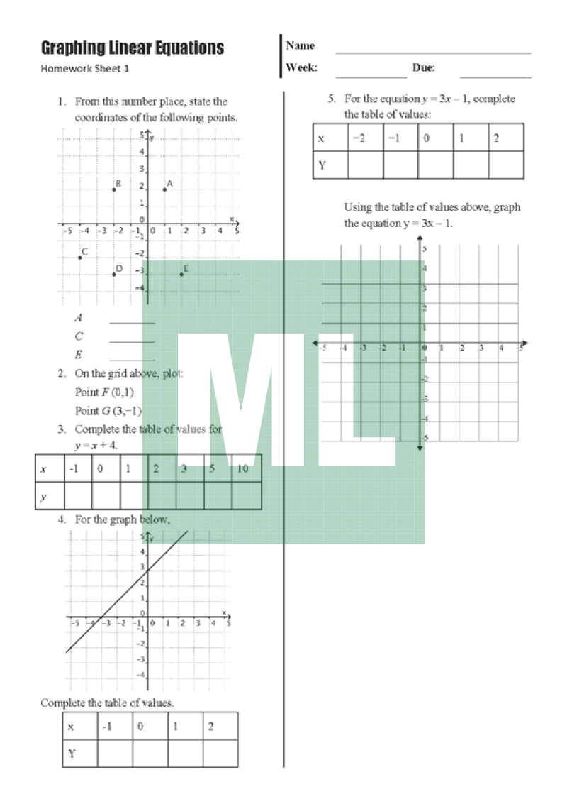 Determining coordinates, plotting points, completing table of values, determine points from a line, graphing a linear equation.