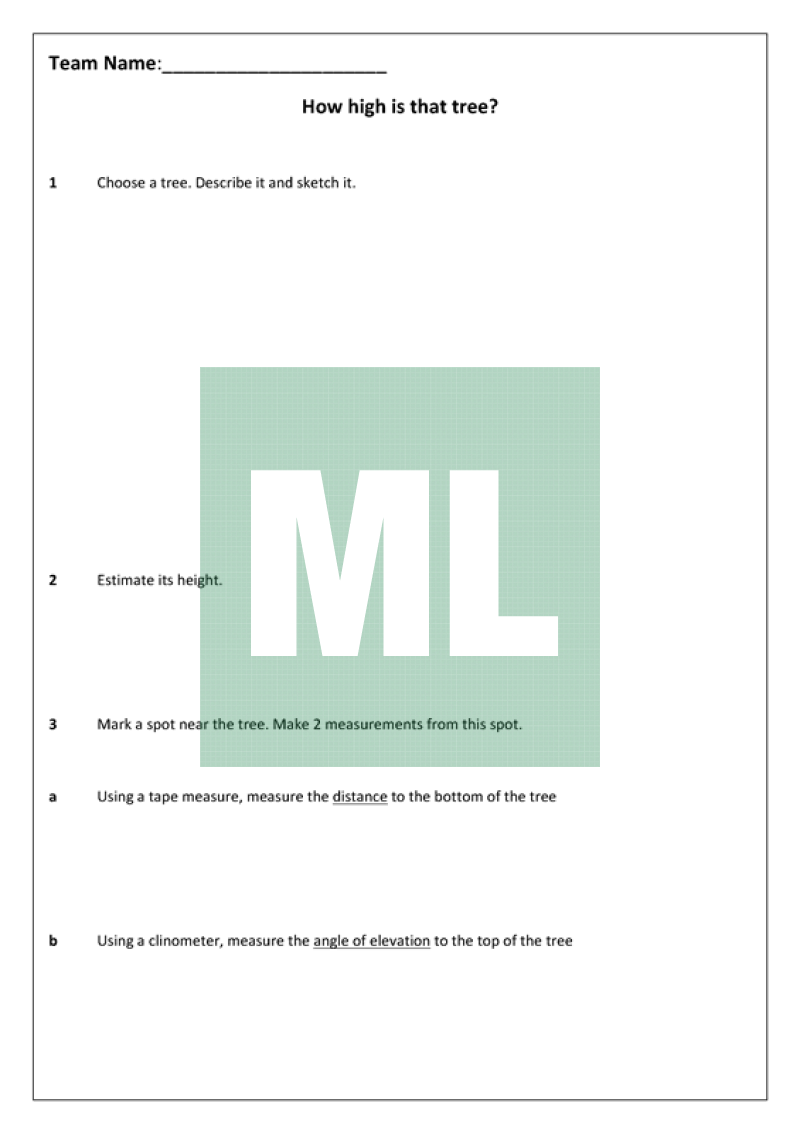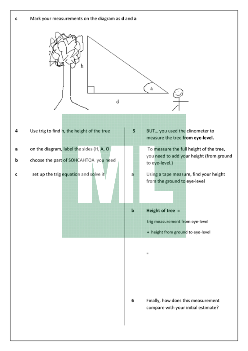 Practical outdoor activity on right-angled trigonometry. Students work in small groups to measure the height of a tree. They need a clinometer, measuring tape, scientific calculator, pen and this worksheet.