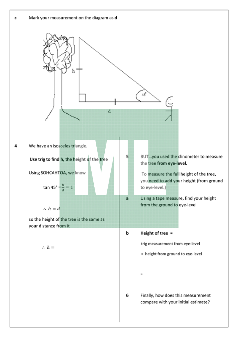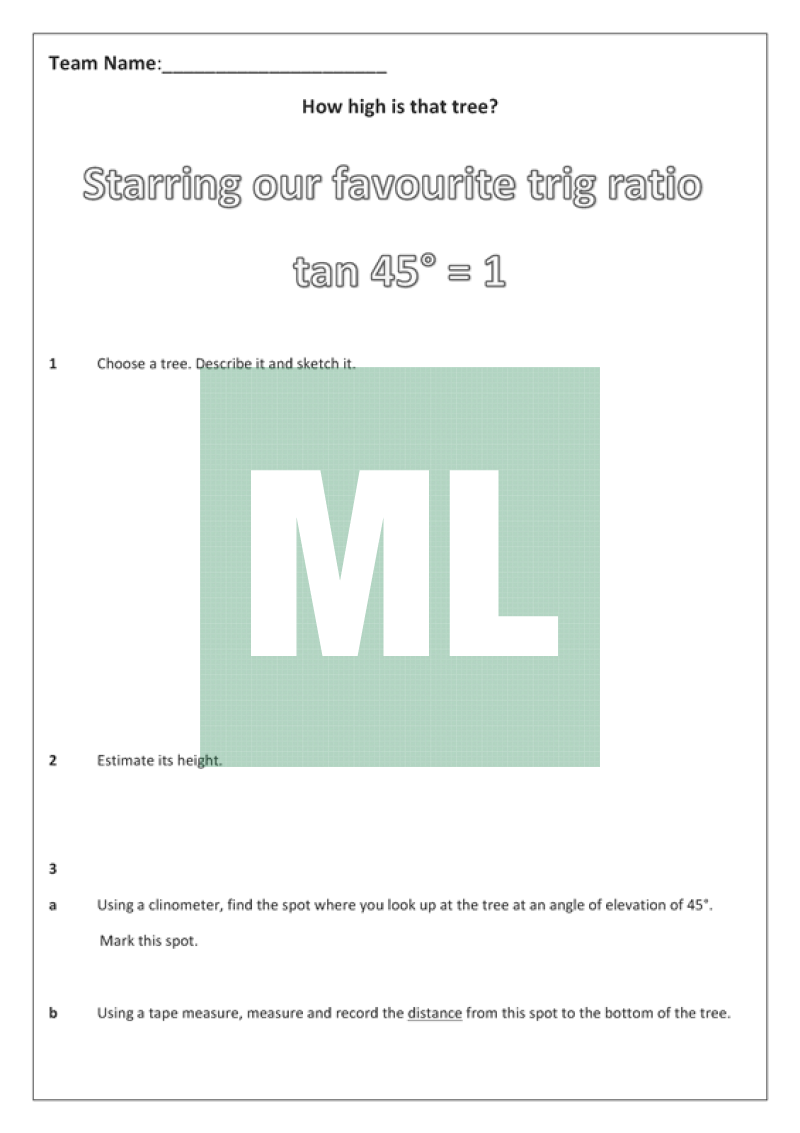 A practical activity using right-angled trig. Students work in small groups to measure the height of a tree, using the short-cut of an angle of elevation of 45 degrees. They need a clinometer, tape measure, scientific calculator, pen and this worksheet.