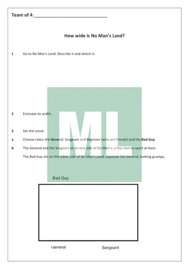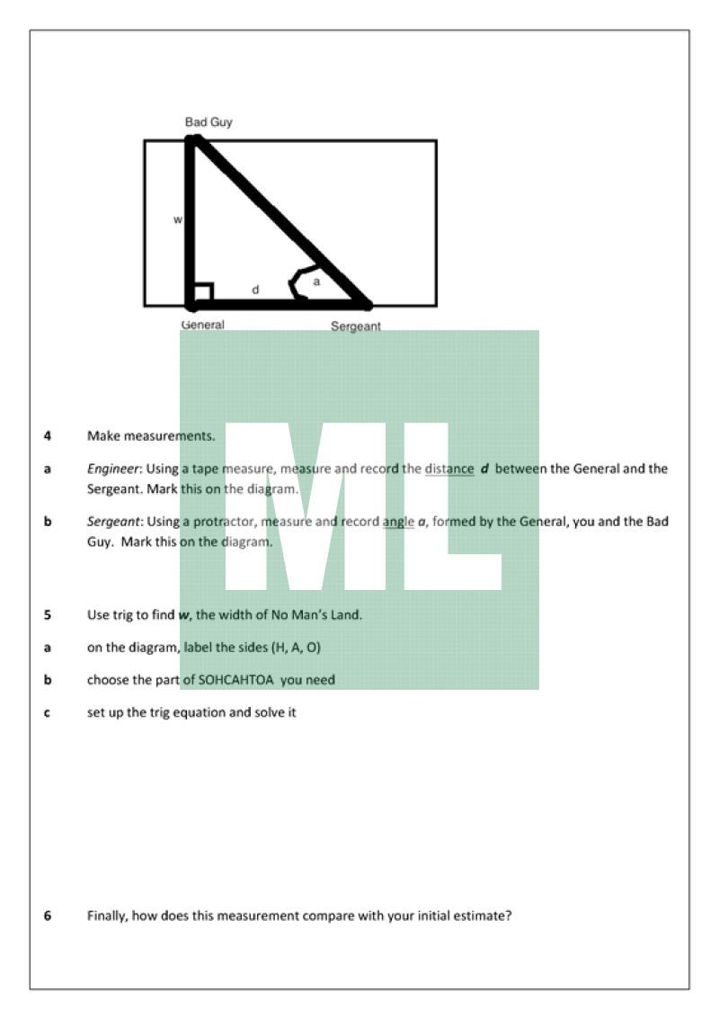 Practical activity on right-angled trig. Students work as a small team to measure the width of No-Man's Land (which could be a quadrangle, basketball court, oval, classroom). They need a protractor and measuring tape.