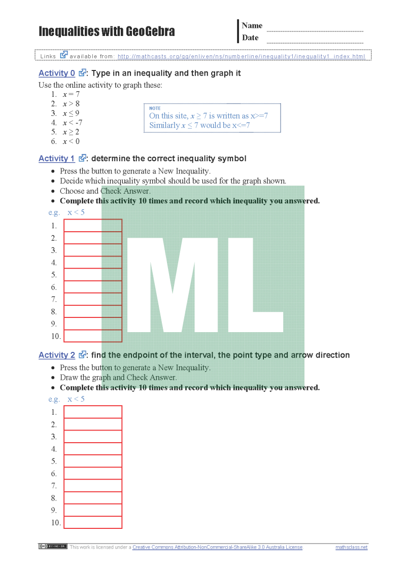 Worksheet to accompany Inequalities with GeoGebra activities.