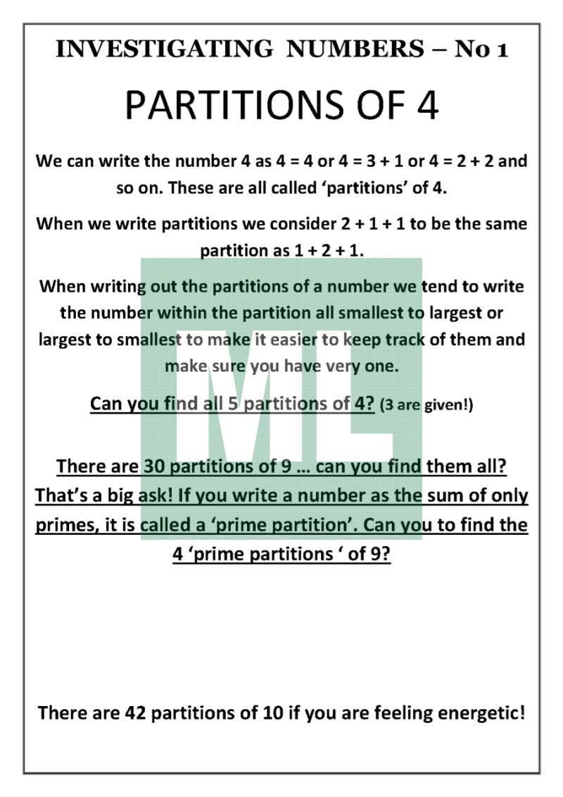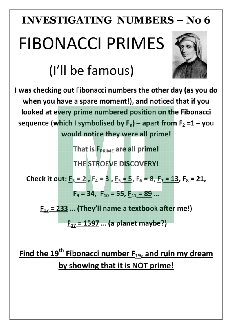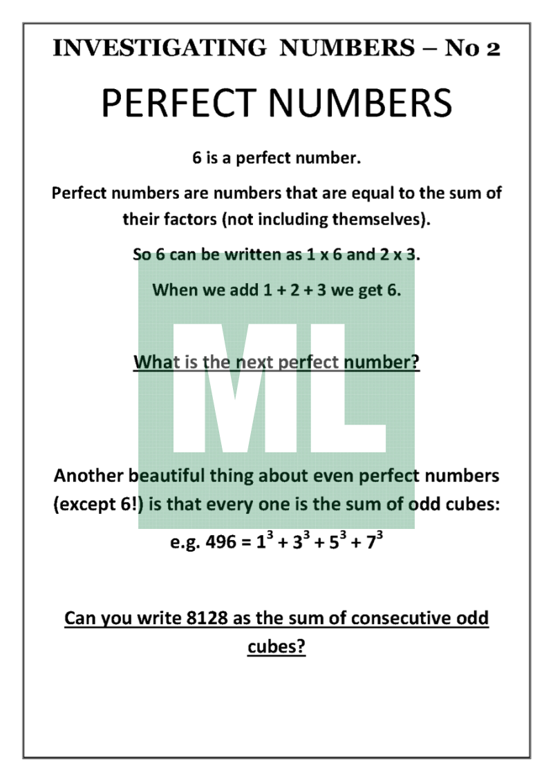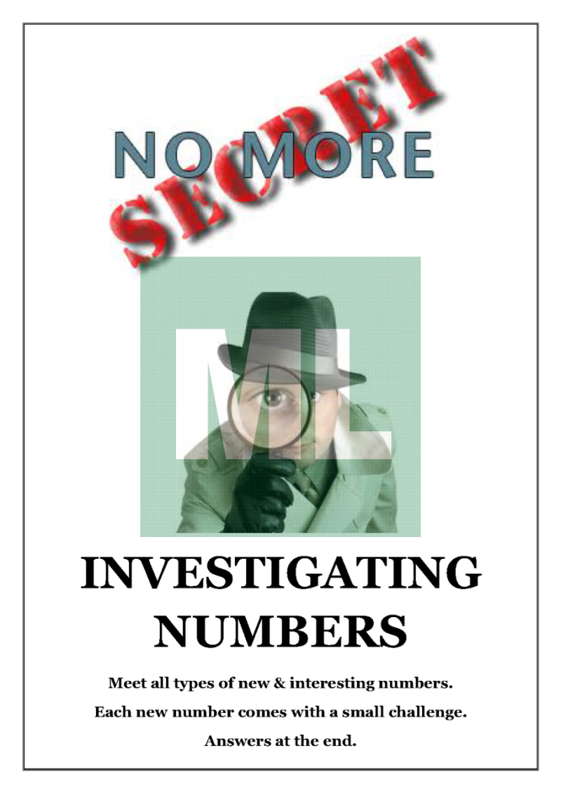 A set of 40 investigations into different types of numbers - Narcissistic, Kaprekan, Keith, Betrothed, Bell, Proth and many more. Each investigation explains something about the number being investigated & then sets a challenge for the students. All answers are from 1 to 100. Solutions on last 2 pages.