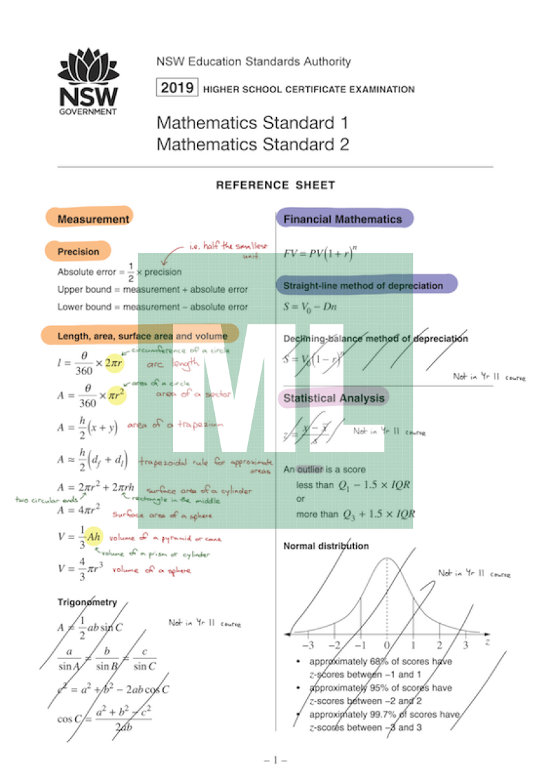 Attribution: Based on the Mathematics Standard 1 and 2 Reference Sheet from NESA. [Retrieved September 2018]