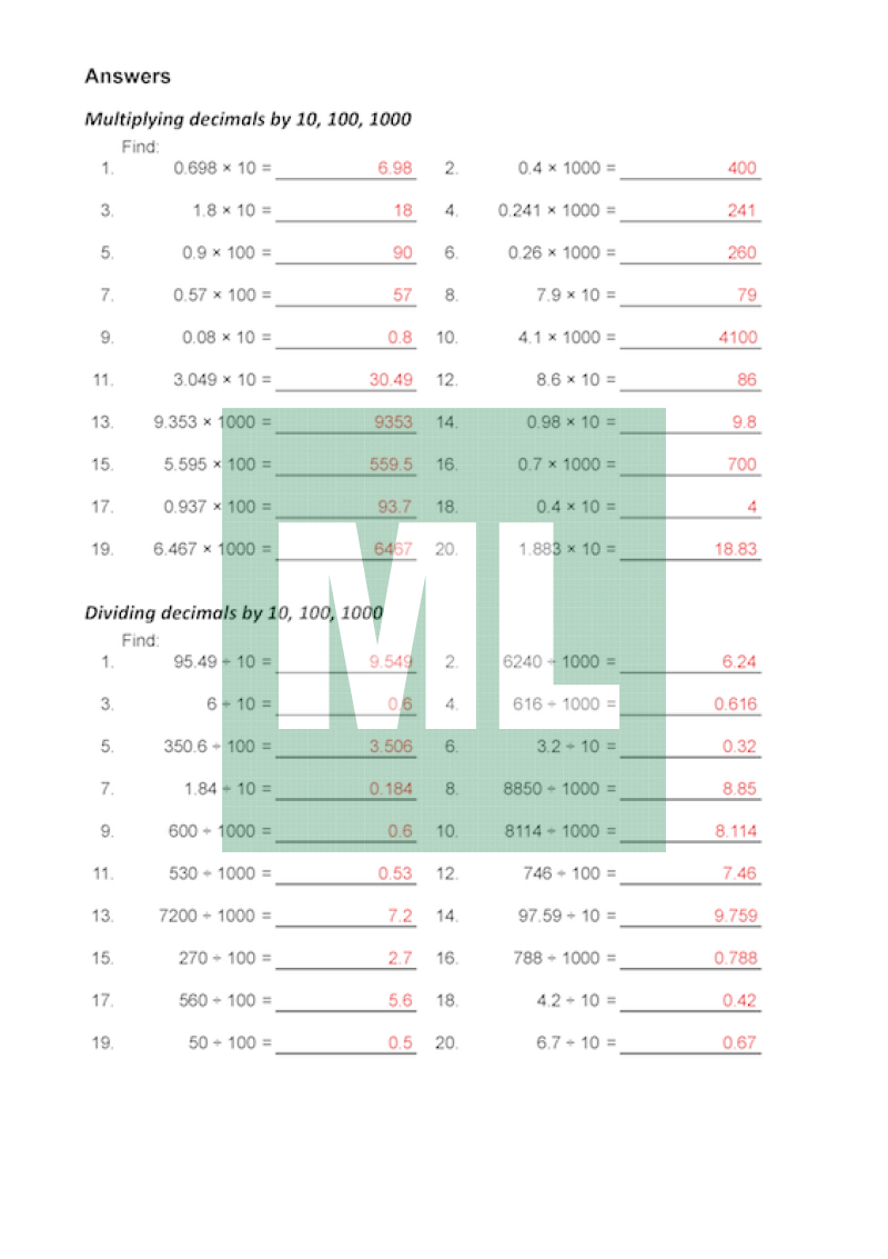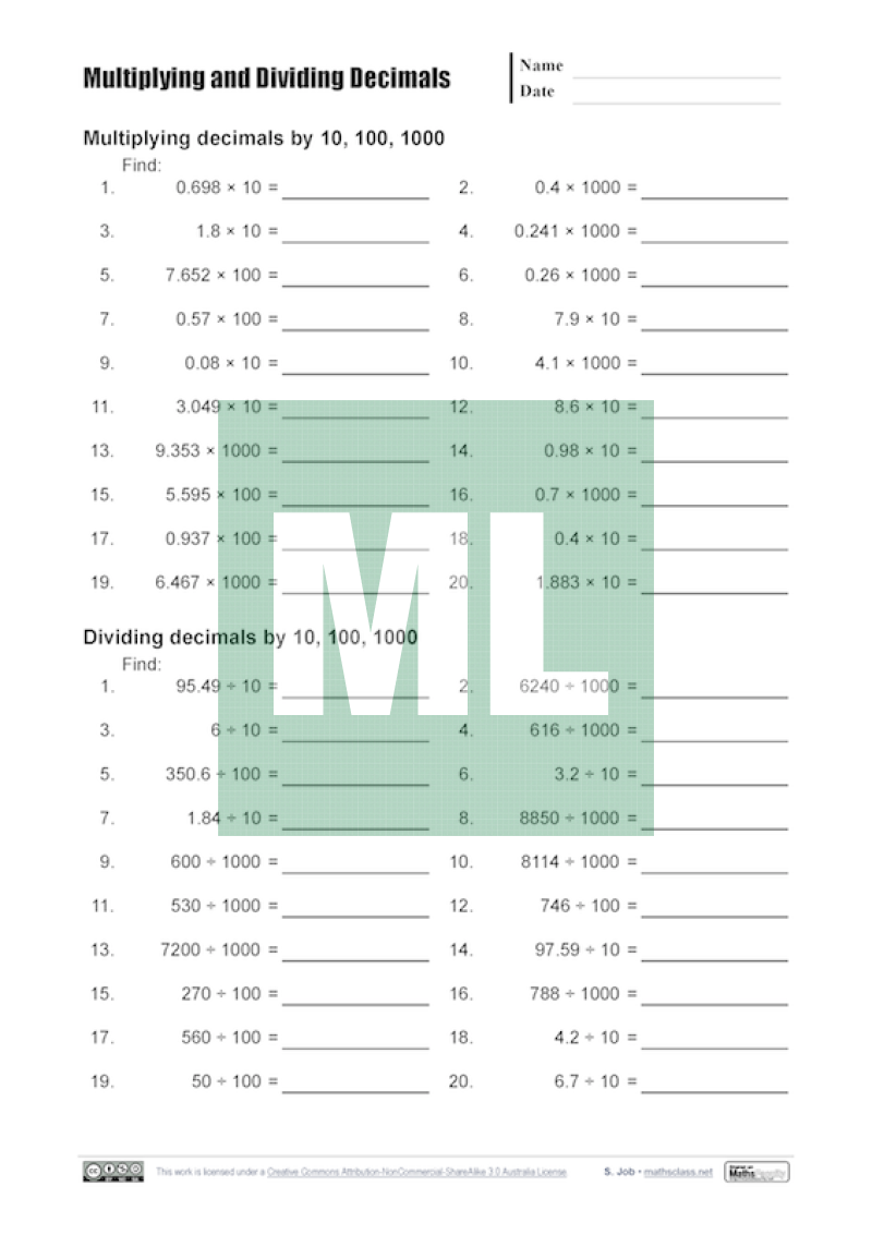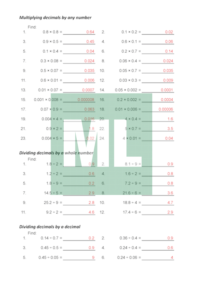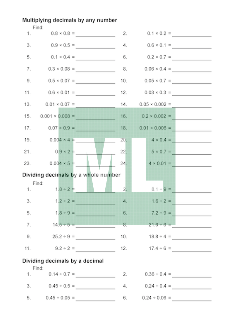 A basic drill sheet for multiply and dividing decimals includes: