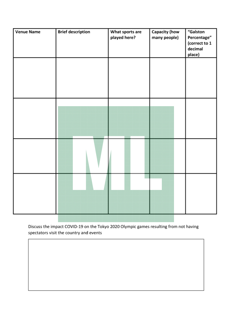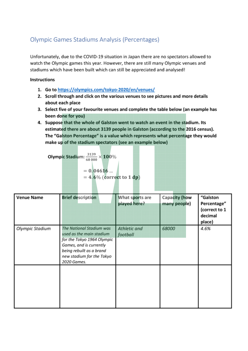Investigate the stadiums of the 2020 Tokyo Olympics for capacity and compare this with your local area (replace for Galston in the file).
