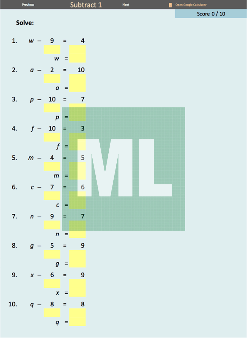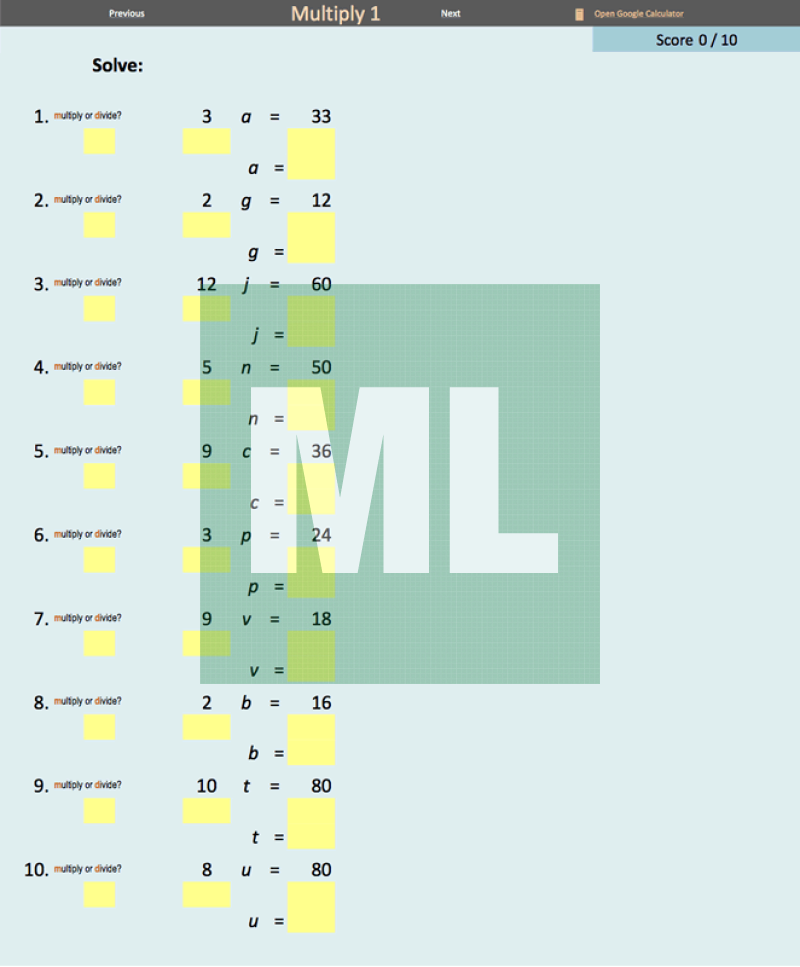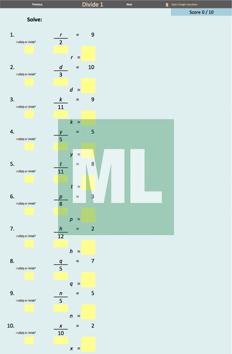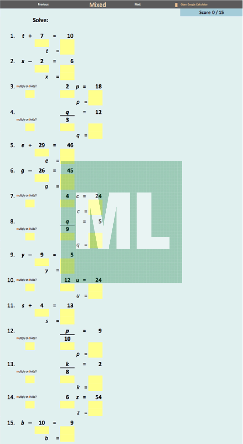 An electronic, self-checking worksheet for solving one-step equations. An activity for students to complete in a computer lab or on their own device. Provide immediate feedback.