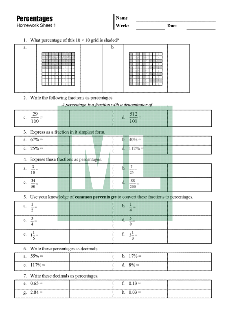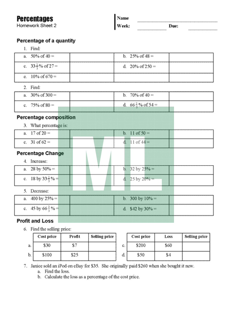 Two homework sheets for percentages. Covers: fractions as percentages, common percentages, percentages as decimals, decimals as percentages, percentage of a quantity, percentage composition, percentage change, profit and loss.
