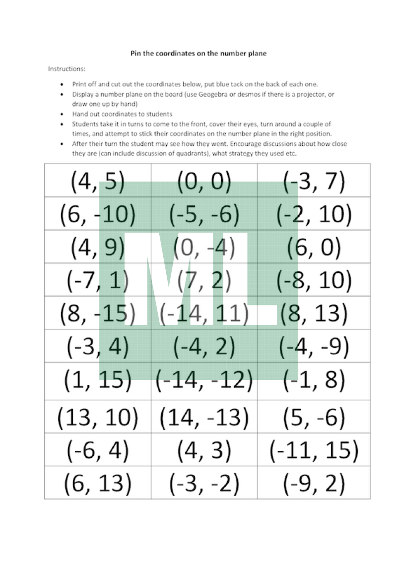 A modification of the game 'pin the tail on the donkey'. To be used when students are learning coordinates on the number plane, or as a fun way to review coordinates prior to teaching further coordinate geometry.