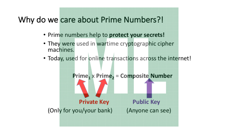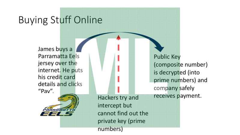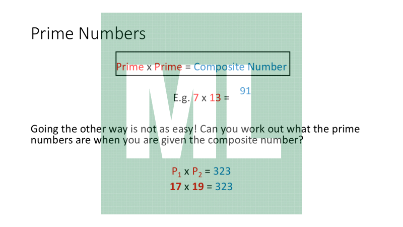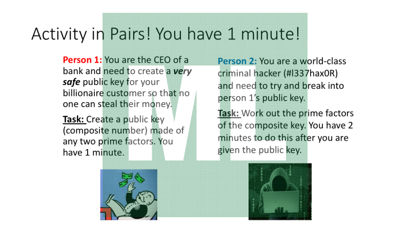 Showing year 7 students how prime numbers are used as secret keys to protect confidential information like your bank details. Activity to be done in pairs where someone is the 'banker' and someone is trying to 'hack' the code.