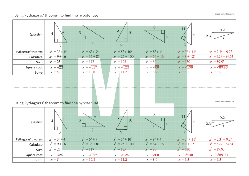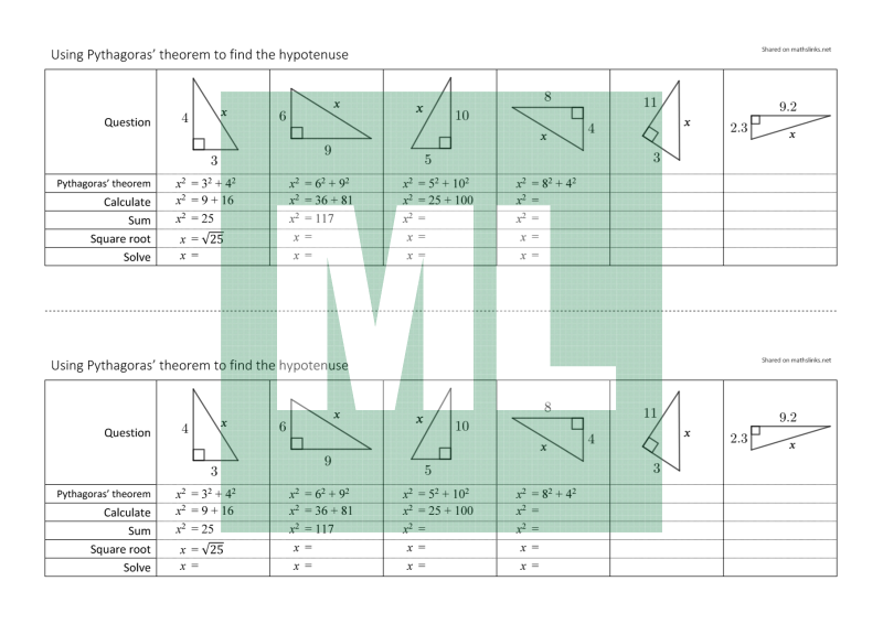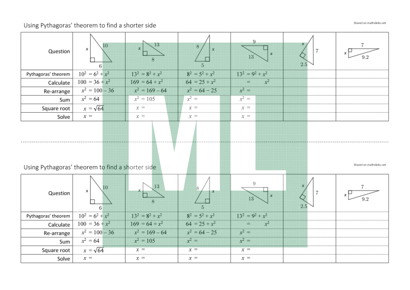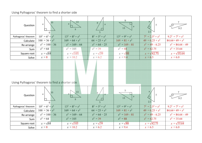 I present Pythagoras' theorem examples differently to the version above, and I've also included a version to find the shorter side.