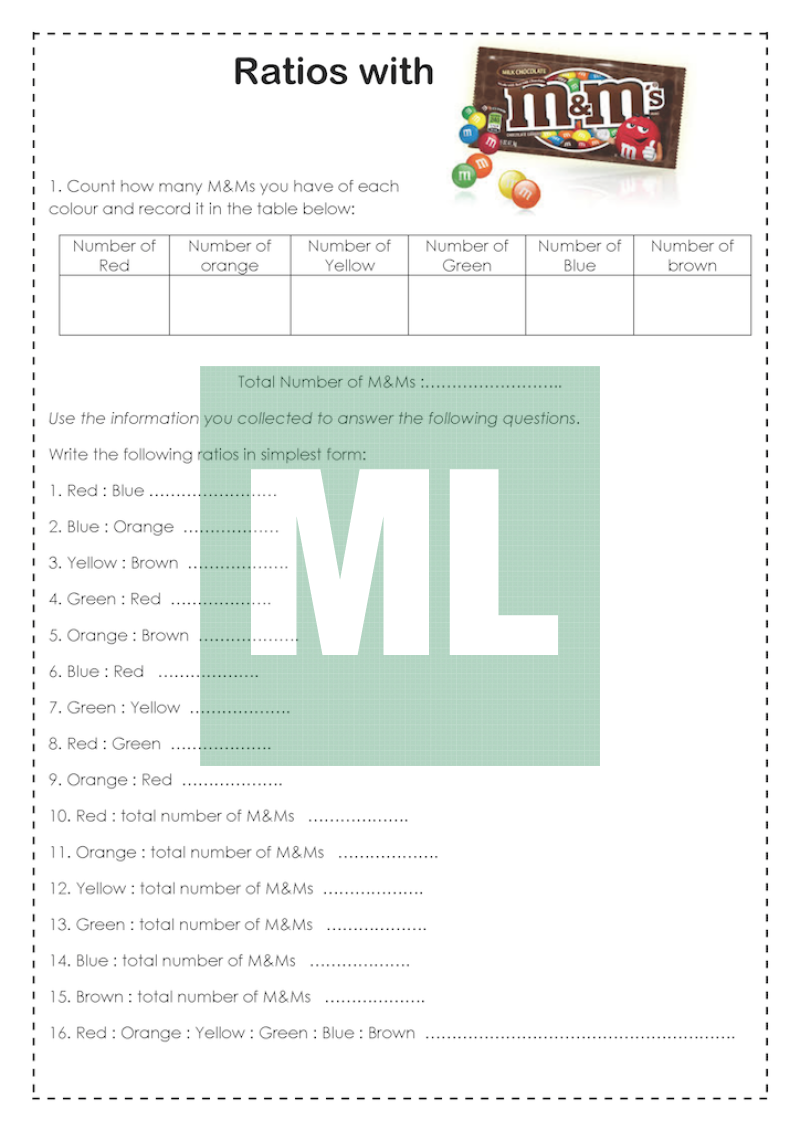 A combined investigation and fun hands on activity using m&ms to revise writing ratios and using ratios and percentages.