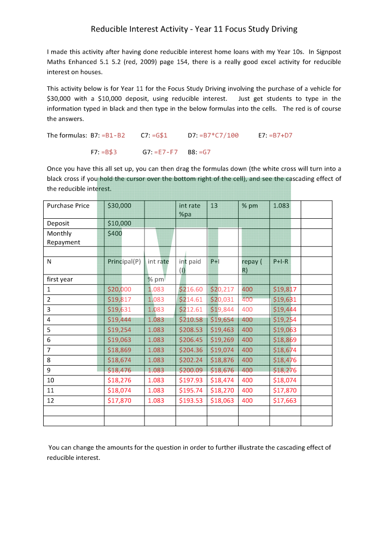 Instructions for investigating reducible interest for a loan to purchase a car (Driving Focus Study, Mathematics General Preliminary).
