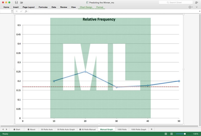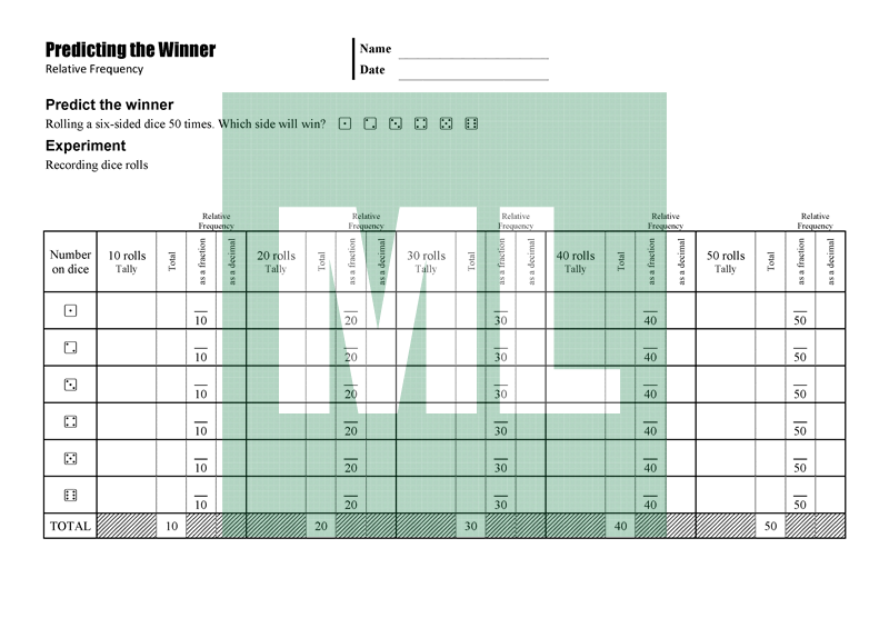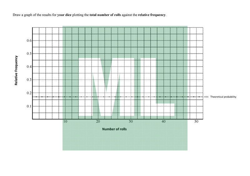 A worksheet for conducting a dice roll experiment, tabulating the results and plotting the relative frequency.