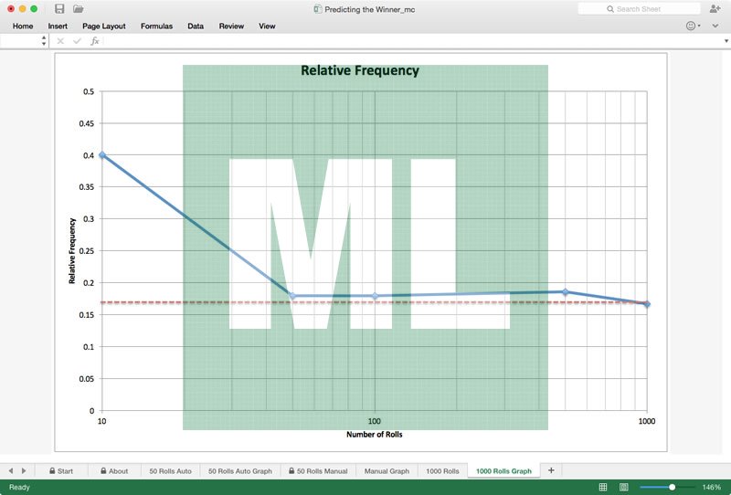 The accompanying Excel worksheet includes a simulation of the same experiment (50 rolls, randomly generated) or an electronic table for recording the results of 50 rolls (with calculations done automatically) and a simulation of 1000 rolls, useful for discussion.