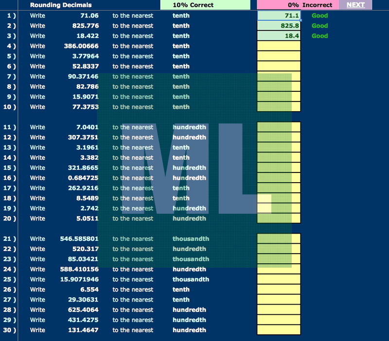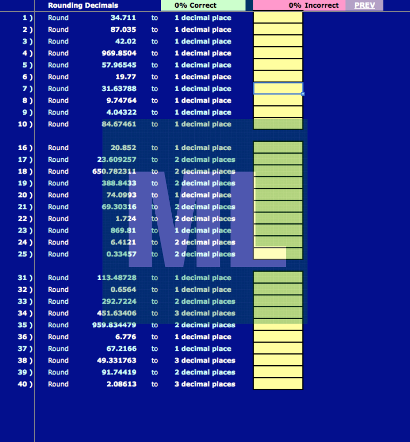 Self-checking Excel worksheet for practising rounding (to the nearest tenth, hundredth thousandth and to 1, 2 and 3 decimal places).