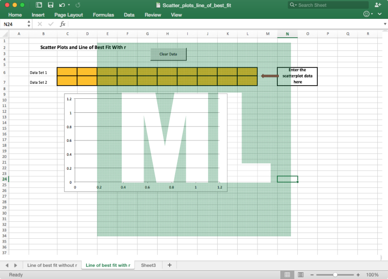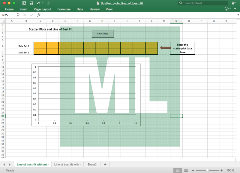 A useable template for entering data and having the scatterplot appear with equation listed automatically. Has a worksheet with r squared displayed, and one without.