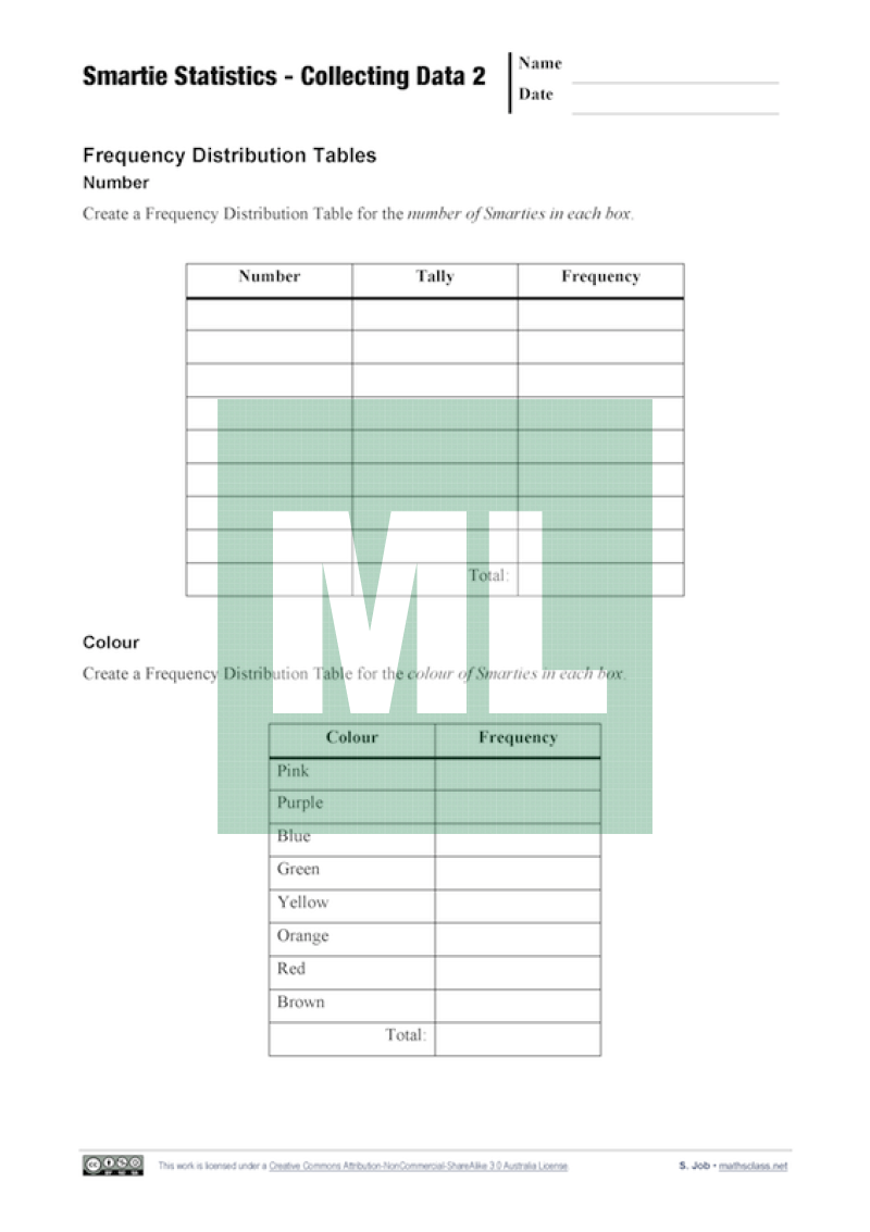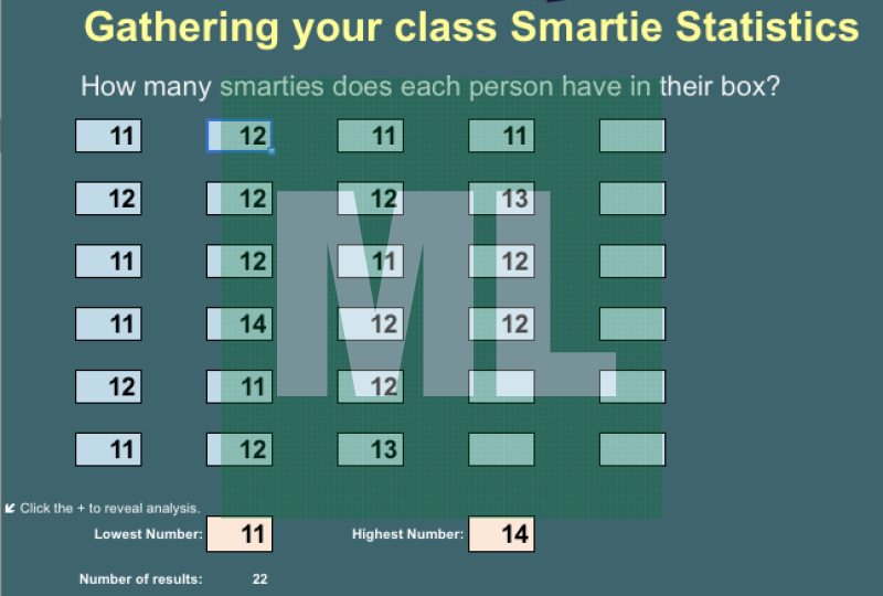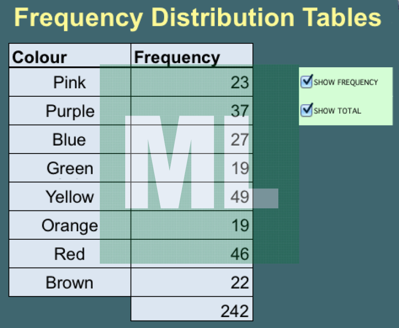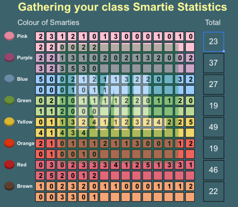 The Excel file is used by the teacher, on a projector/IWB, to collect the data in the class. It allows the teacher to collect the raw data and represent in Frequency Distribution Tables.