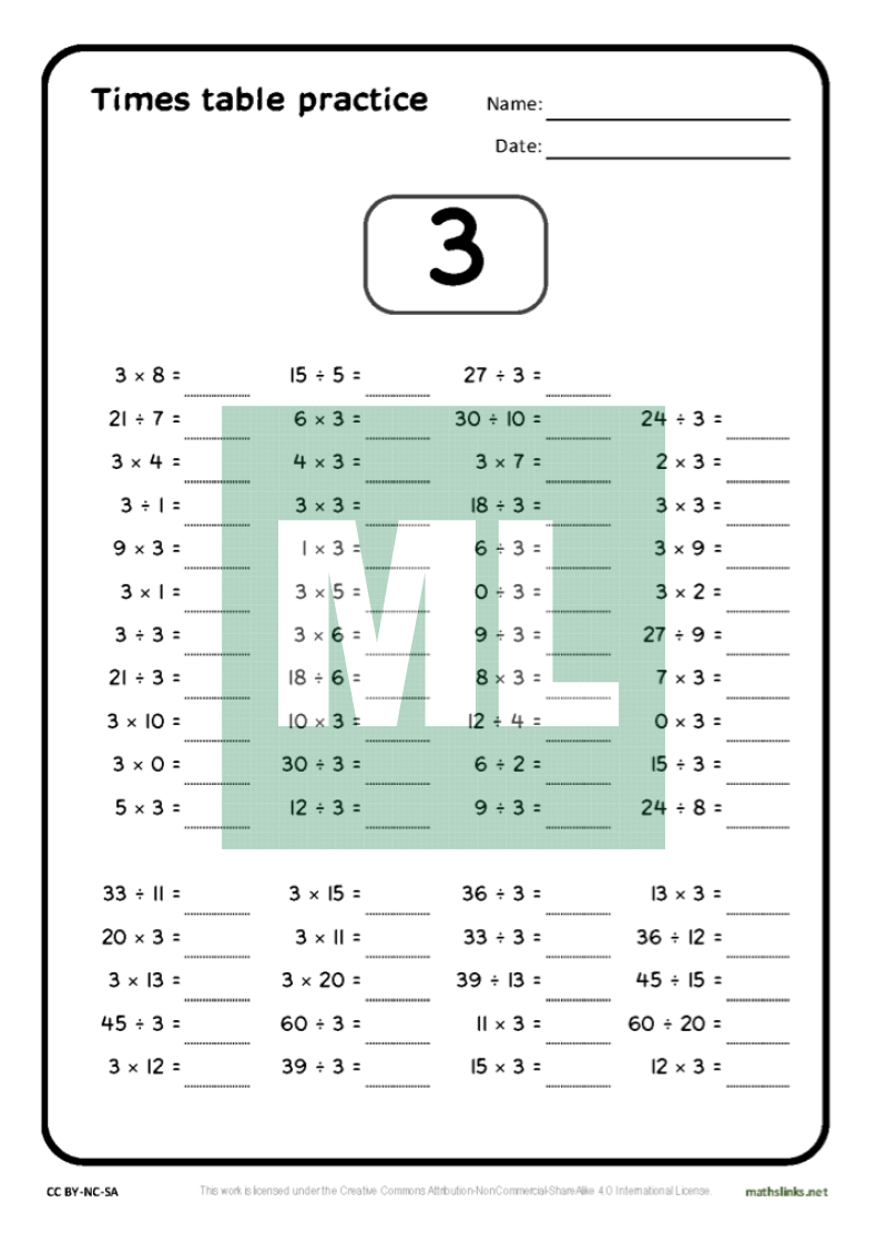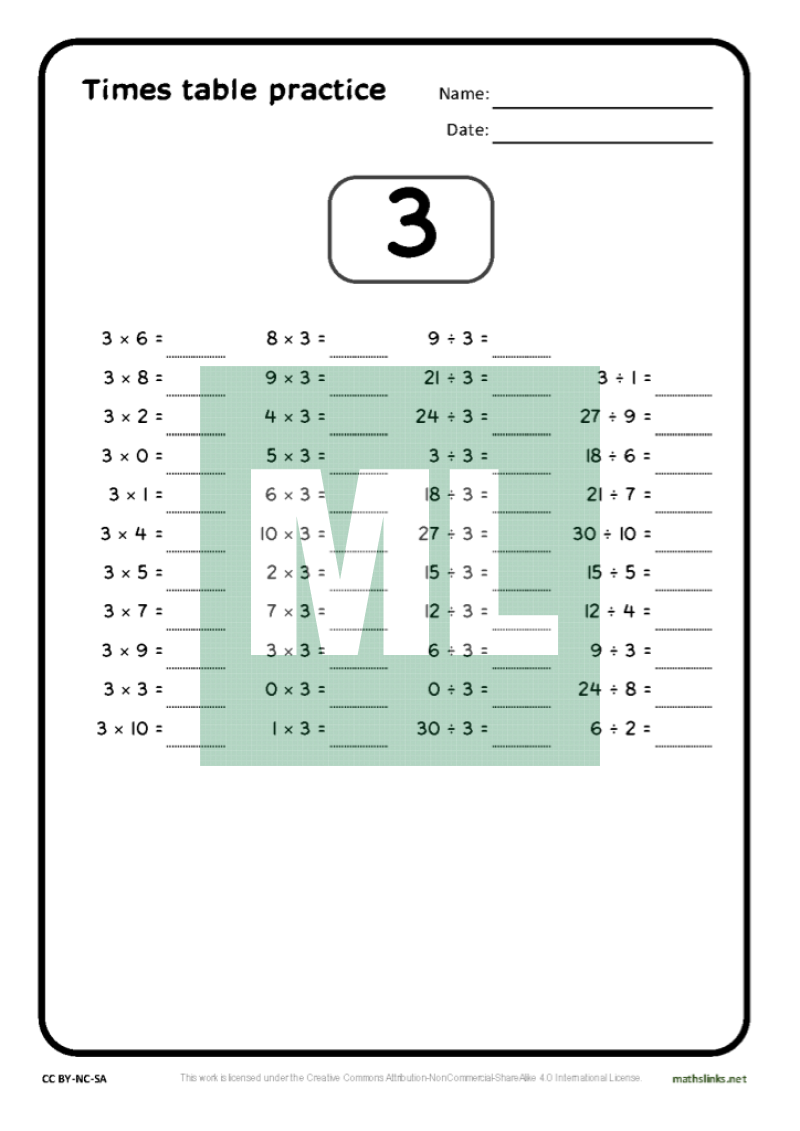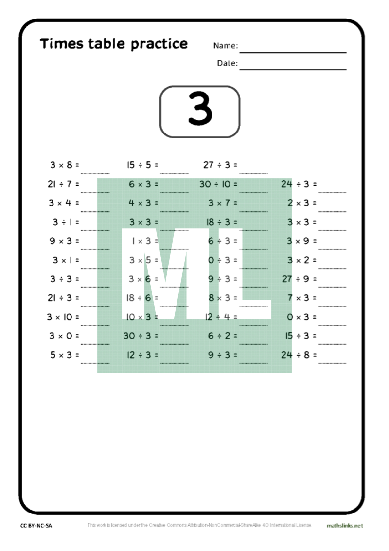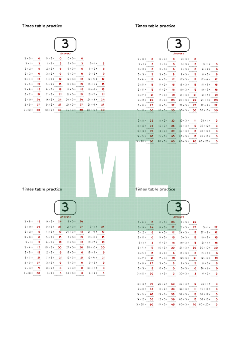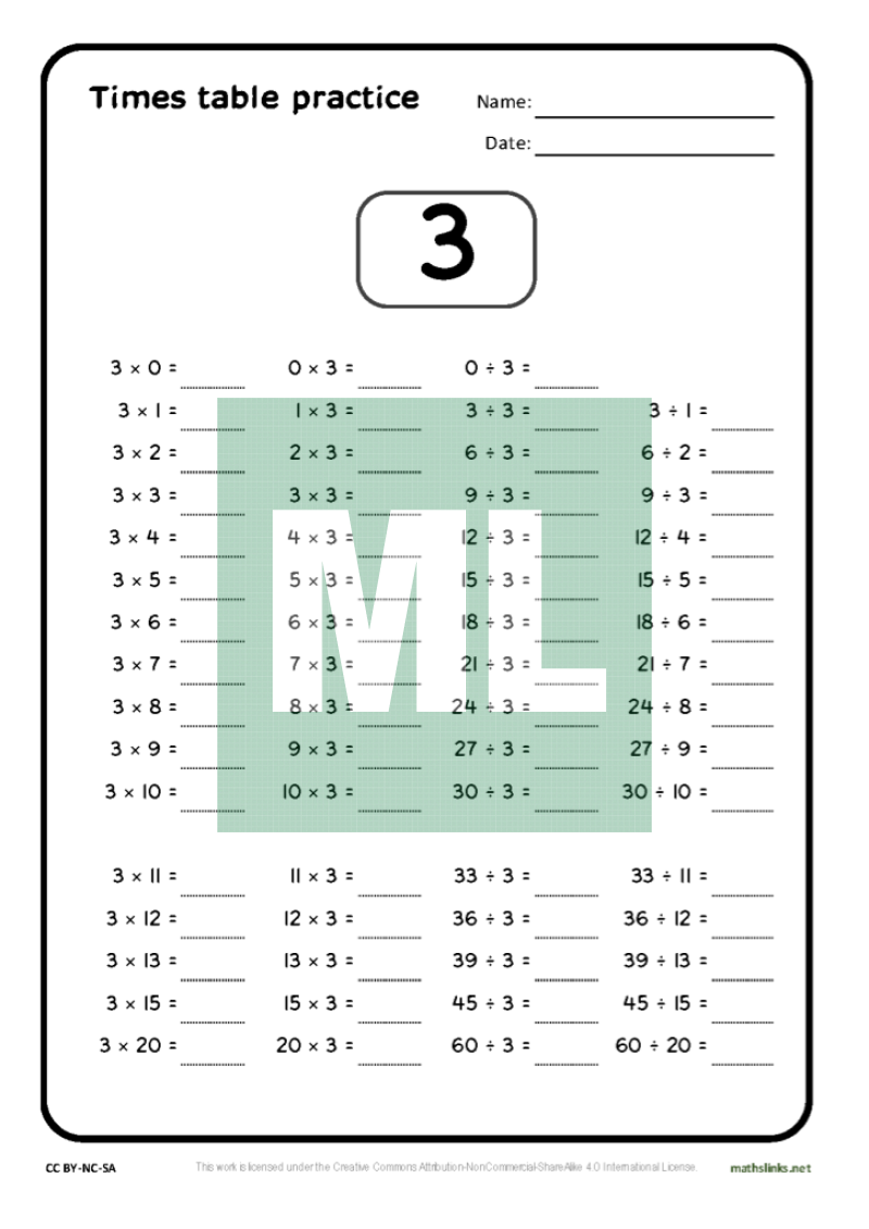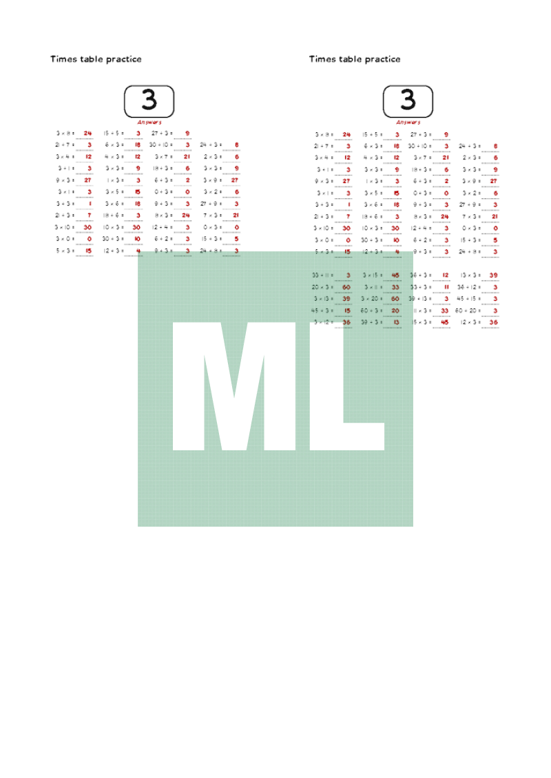Drill pages for practising times tables. These pages focus on the link between multiplication and division facts, and the commutative property of multiplication.