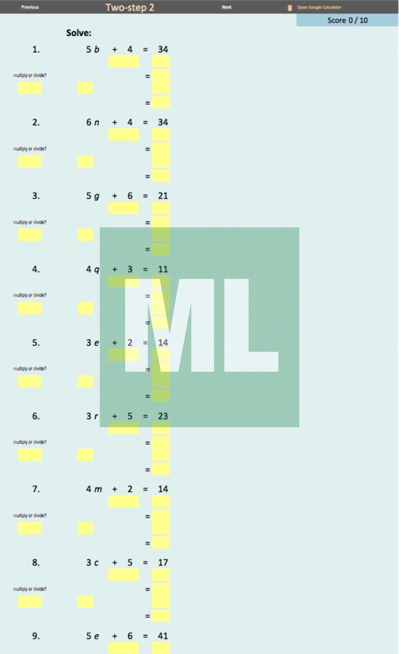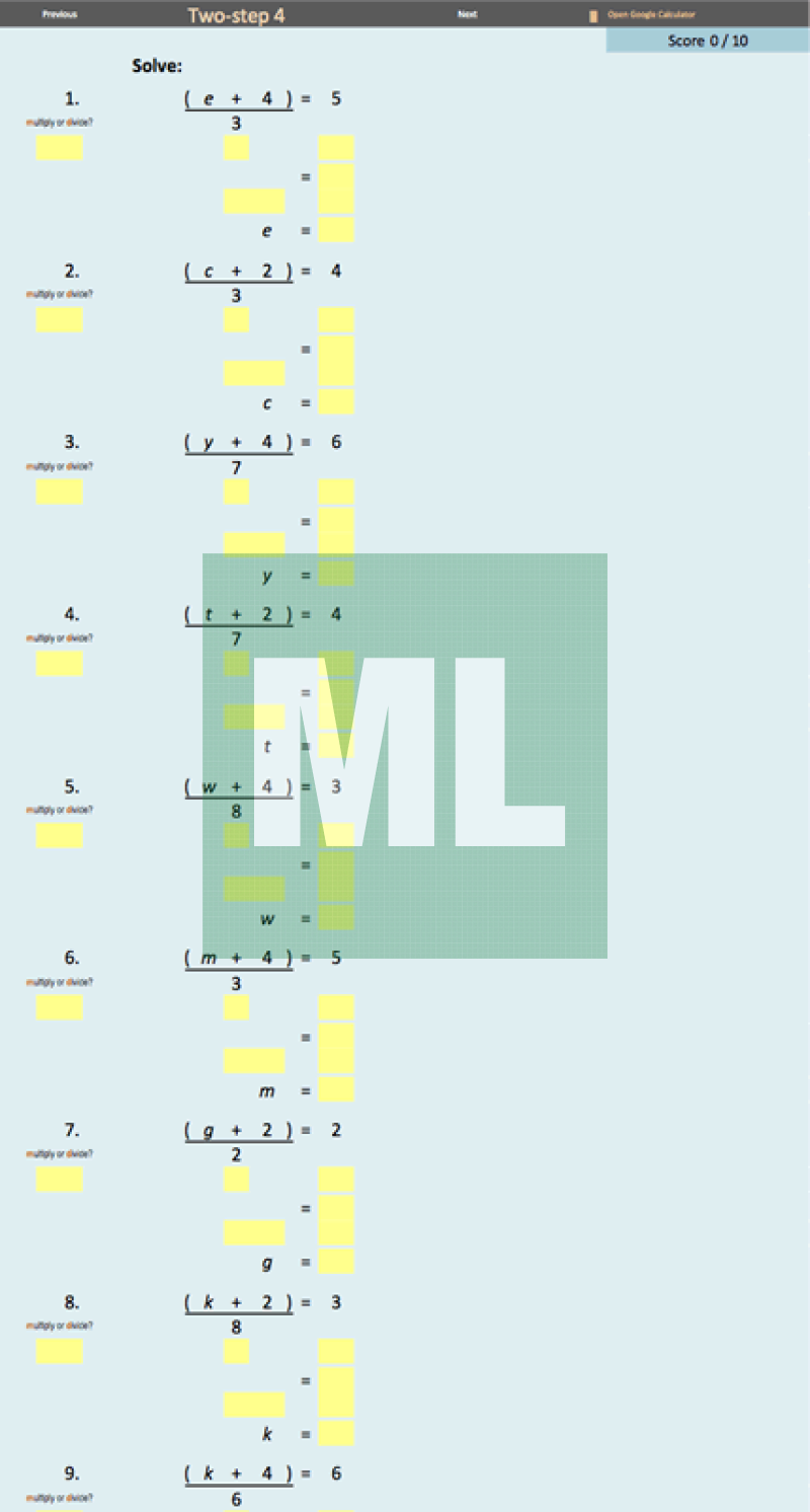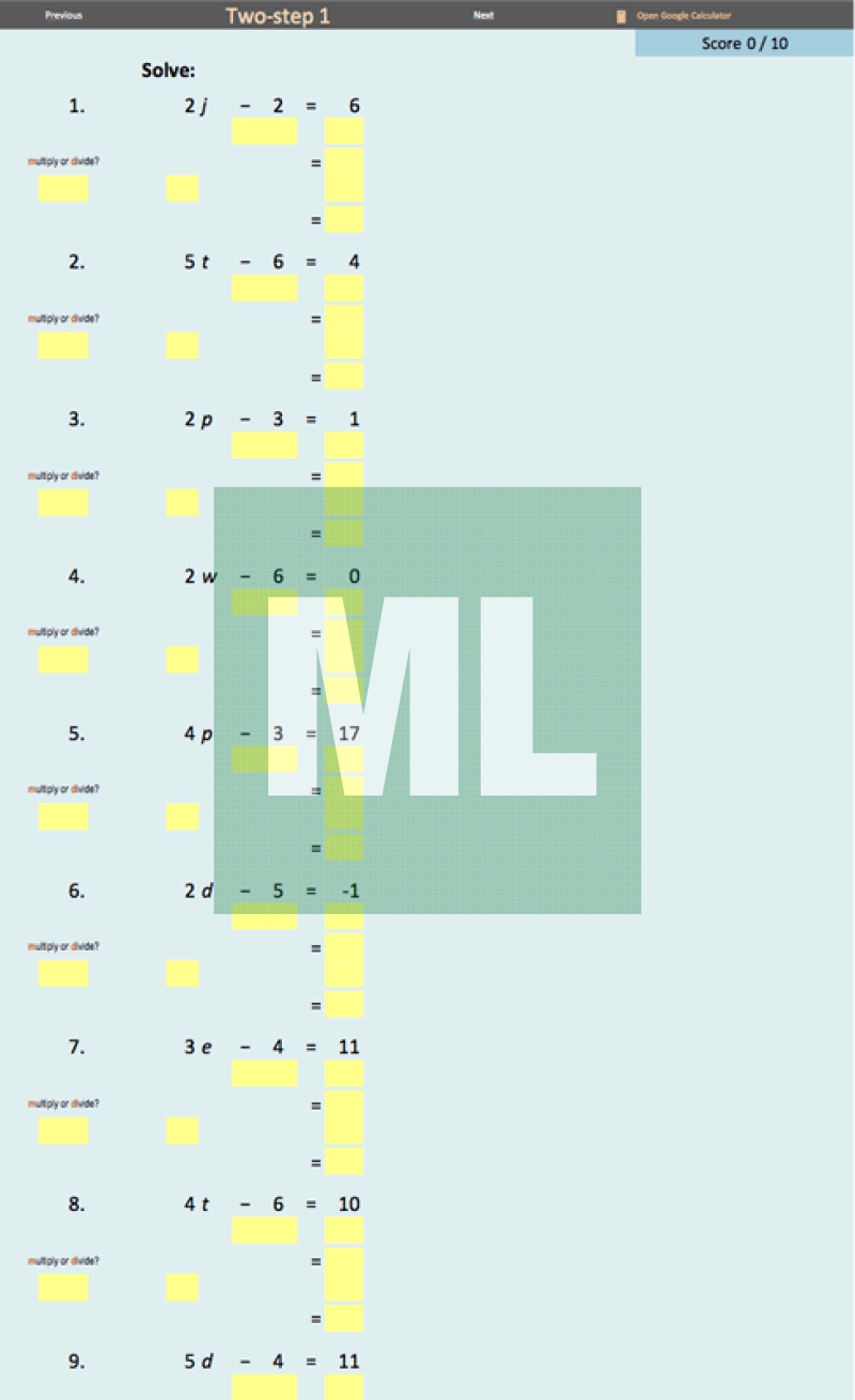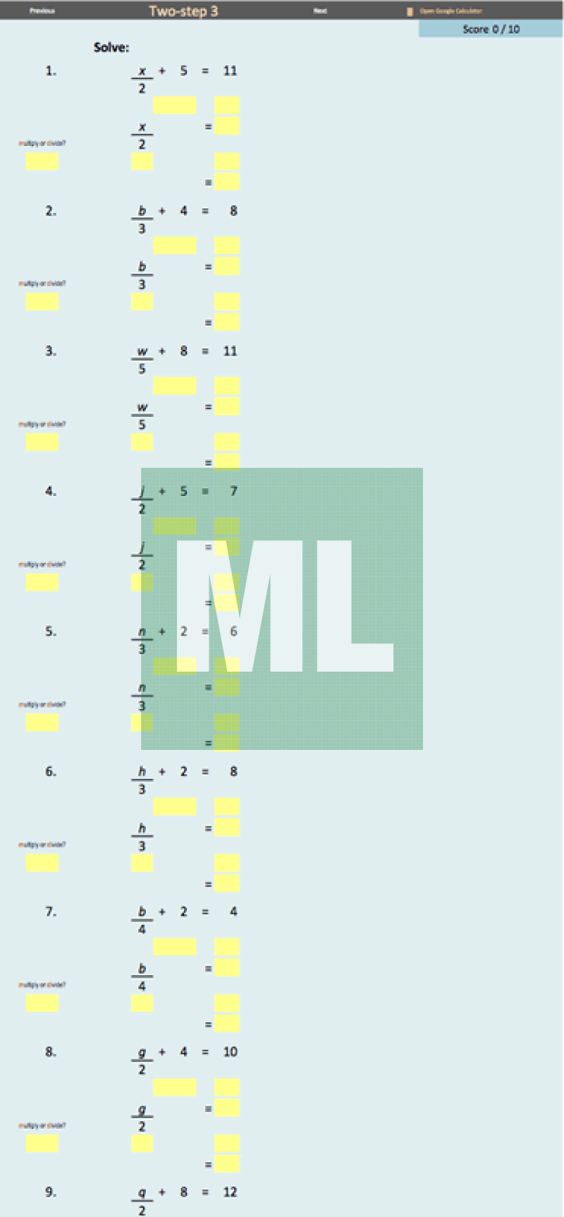 An electronic, self-checking worksheet for solving two-step equations. An activity for students to complete in a computer lab or on their own device. Provide immediate feedback.