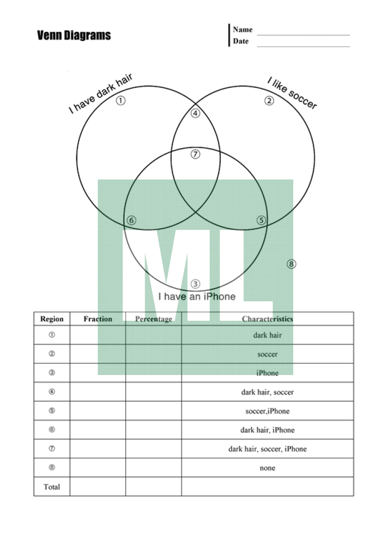 Students complete a simple survey. As a class, the responses are recorded onto a Venn Diagram and tallied in the table.