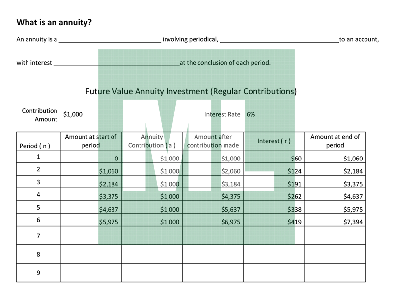 Simple student exercise to introduce an annuity as a form of investment. Students complete the closed passage basic description and complete the investment table.